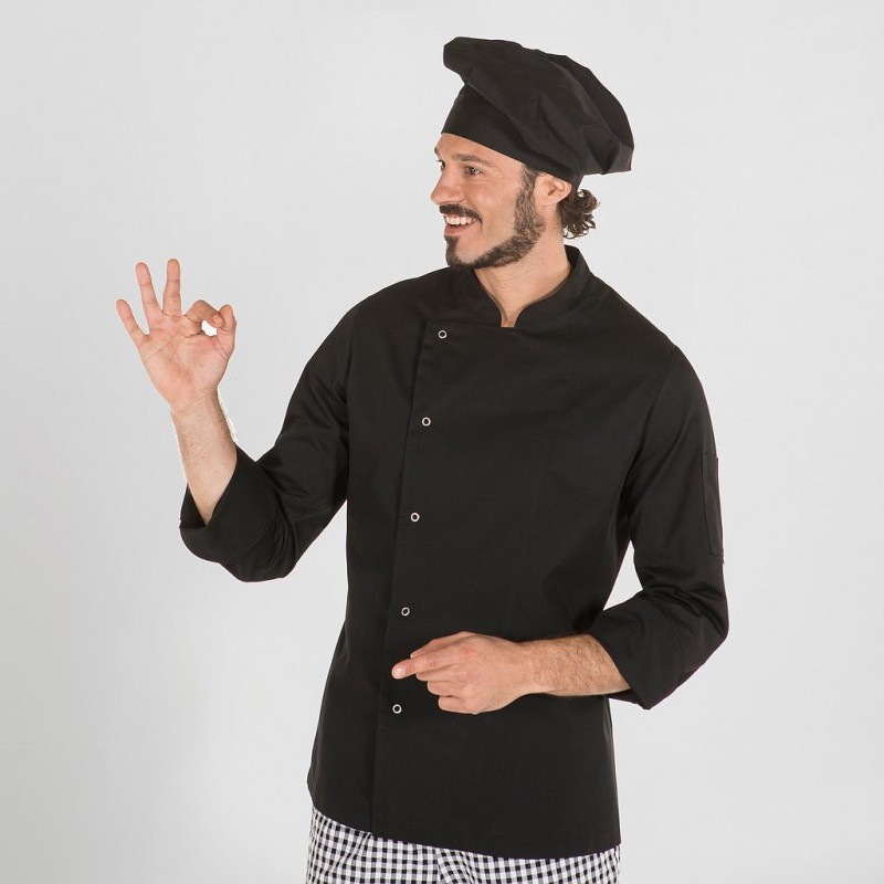 Chaqueta unisex en manga corta, con cuello mao, un bolsillo en la manga izquierda y cierre cruzado mediante botones de presión vistos, semi ajustado, con costadillos en espalda y confeccionada en SARGA de color blanco o negro. Ideal para uniforme de cocineros y chefs en hostelería, restauración y cocina en general. Disponible también en manga larga...