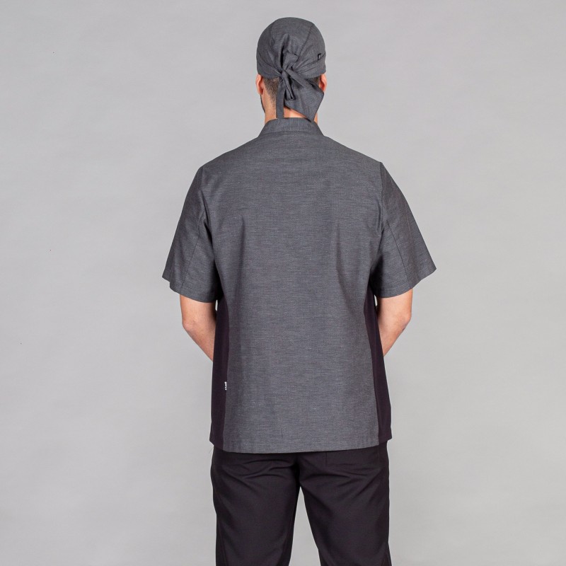 Prenda semi ajustada, confeccionada en CHAMBRAY DE ROMBOS (70% Algodón - 30% Poliéster) en color gris marengo, con tejido técnico AEROSILVER en los costados.