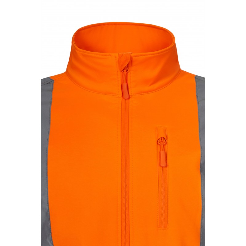 SOFT SHELL Alta Visibilidad, tejido triple capa, cierre central con cremallera invertida, tapeta interna vuelta en la parte superior, tapando la cremallera, cintas reflectantes en torso, hombros y mangas y puños ajustables con velcro.