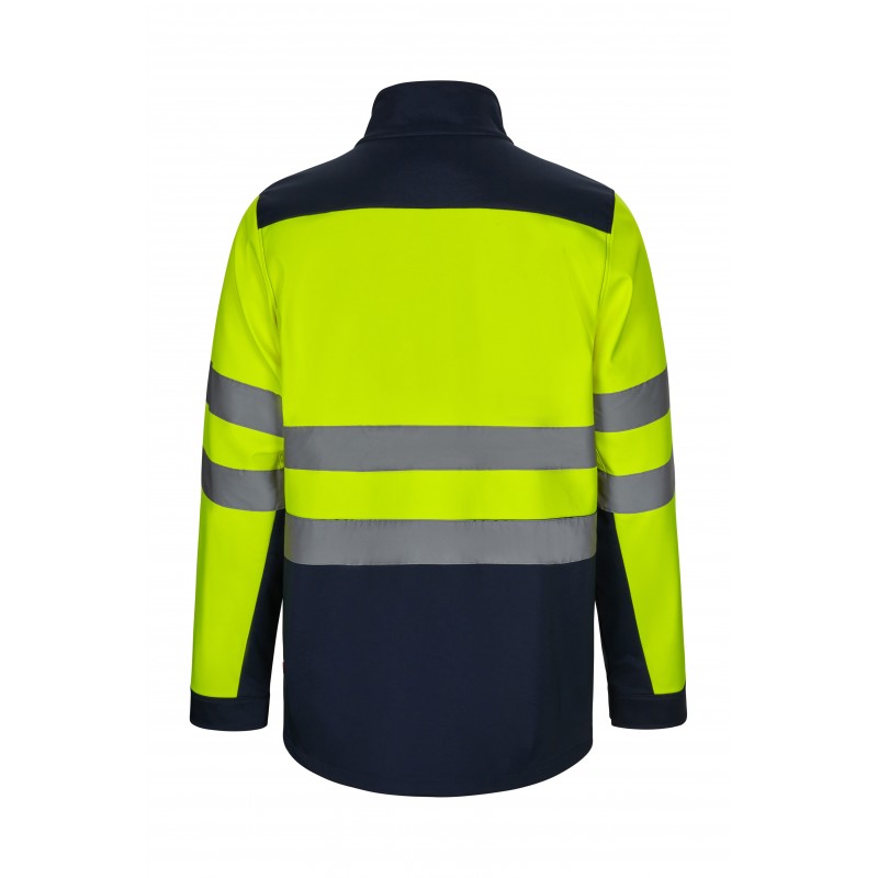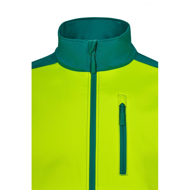 Soft Shell Bicolor Alta Visibilidad, tejido triple capa, cierre central con cremallera invertida en color contraste, tapeta interna vuelta en la parte superior, tapando la cremallera, cintas reflectantes en torso y mangas y puños ajustables con velcro.