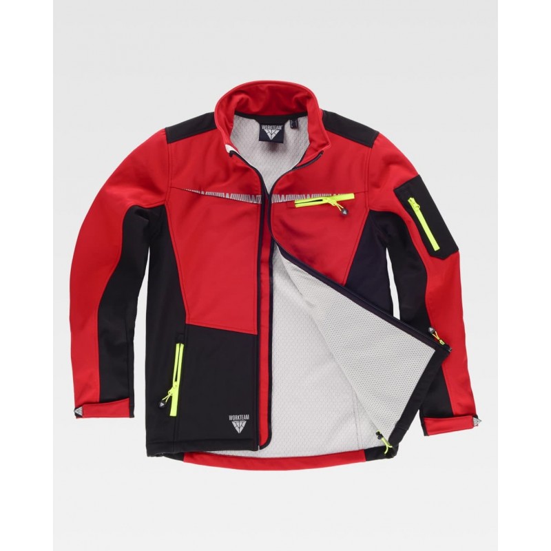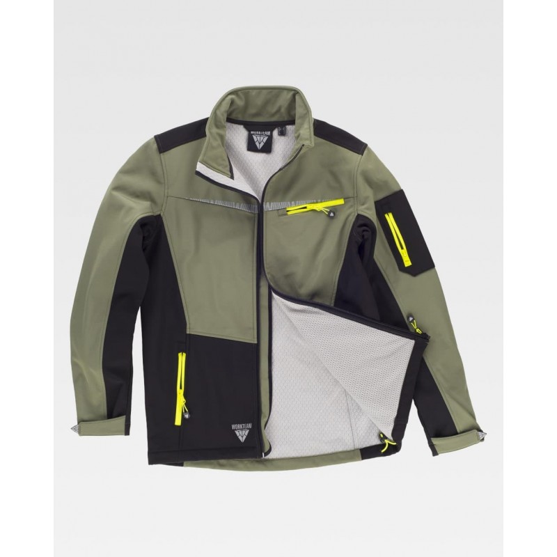 Workshell con detalles reflectantes y manga ranglan y cuello alto y cubrecosturas interior. Capucha con cordón elástico y pieza ajustable. Cierre de cremallera de nylon, solapa protectora interior vuelta en la parte superior cubriendo la cremallera. Un bolso de pecho y dos laterales interiores con cierre de cremallera de nylon, puños ajustables con...