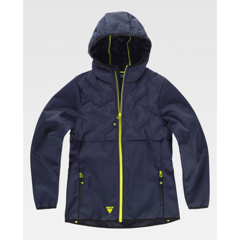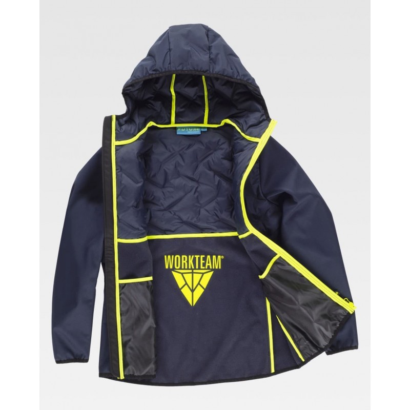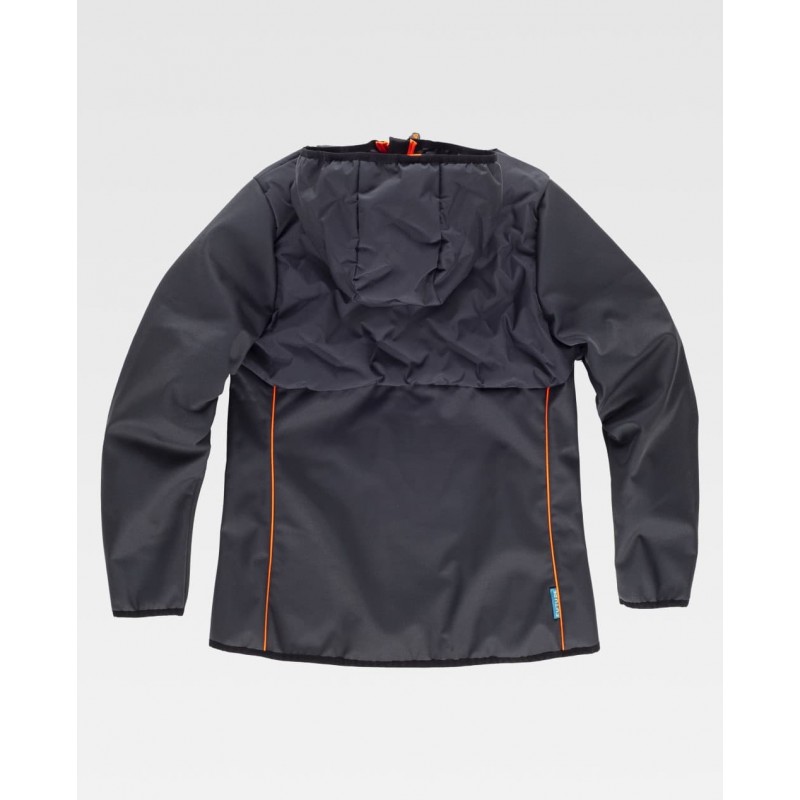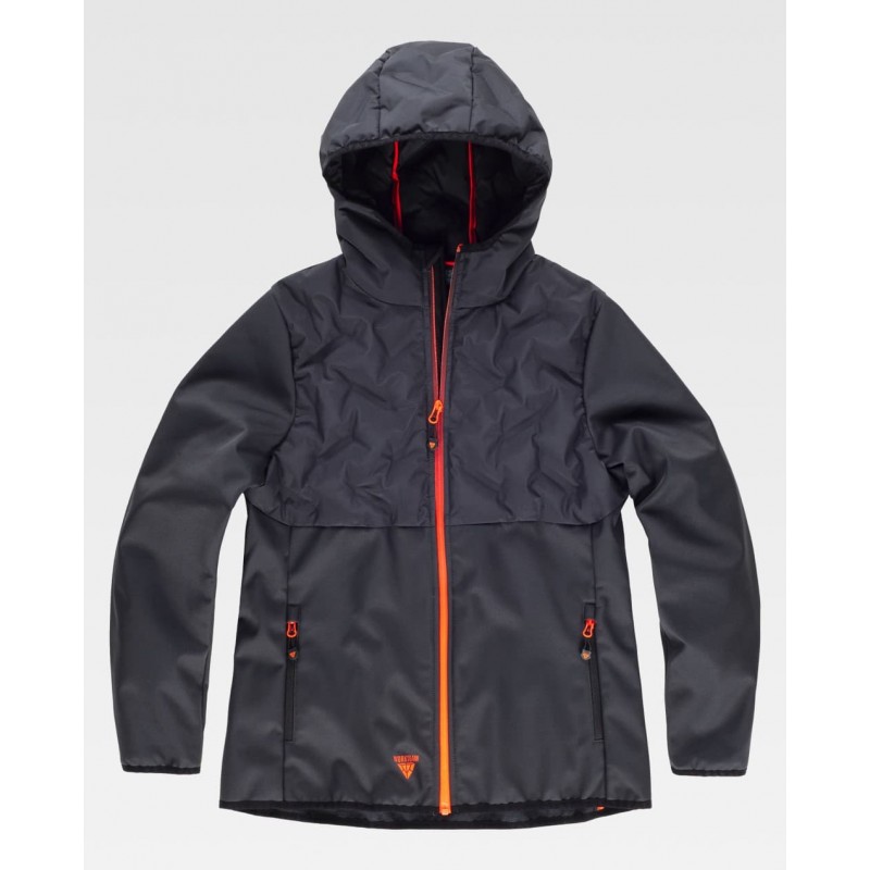 Chaqueta acolchada de mujer combinada con tejido Workshell, capucha con cierre de cremallera de nylon, solapa protectora interior vuelta en la parte superior cubriendo la cremallera.