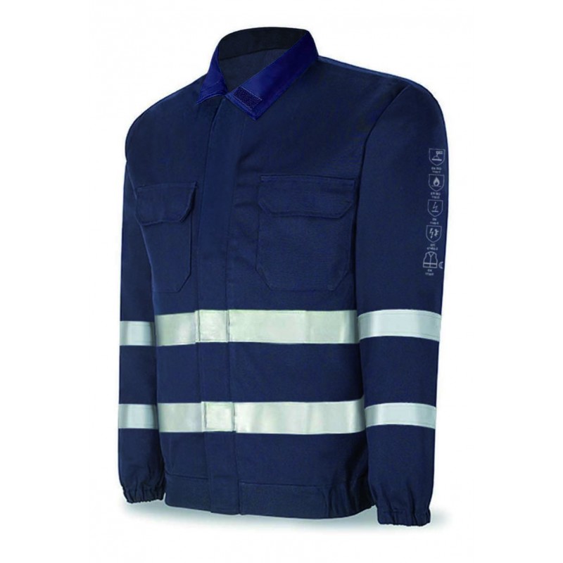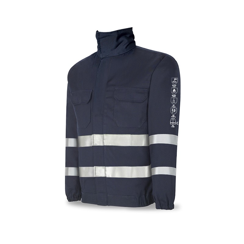 Chaqueta ignífuga y antiestática multinorma Marca PL 988CIR con cintas reflectantes, indicada para protección frente a calor y llama, soldeo y procesos afines.