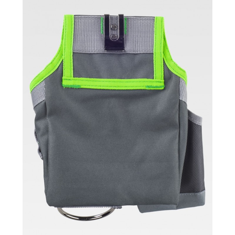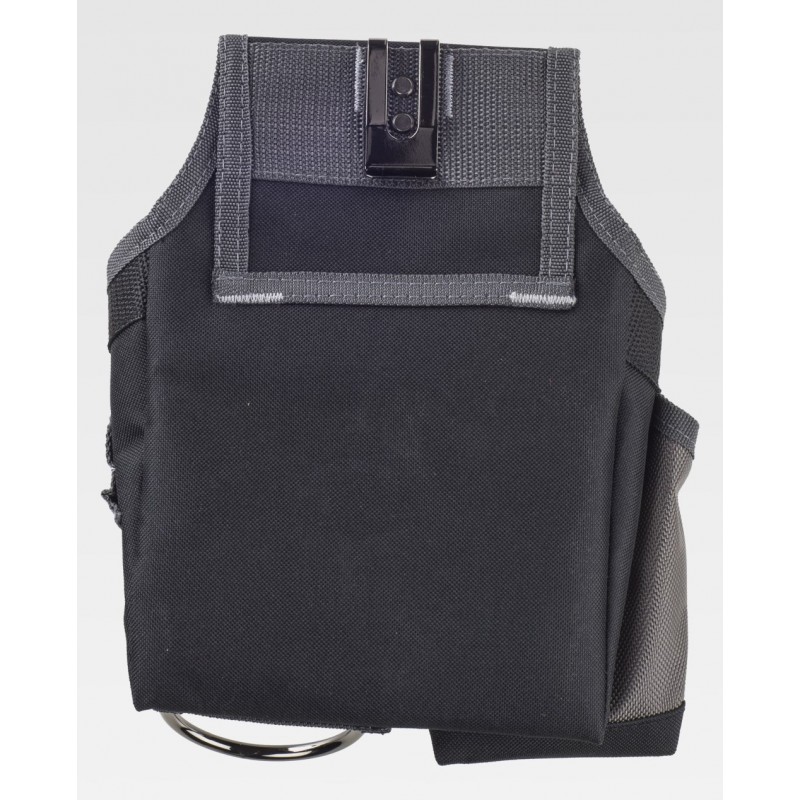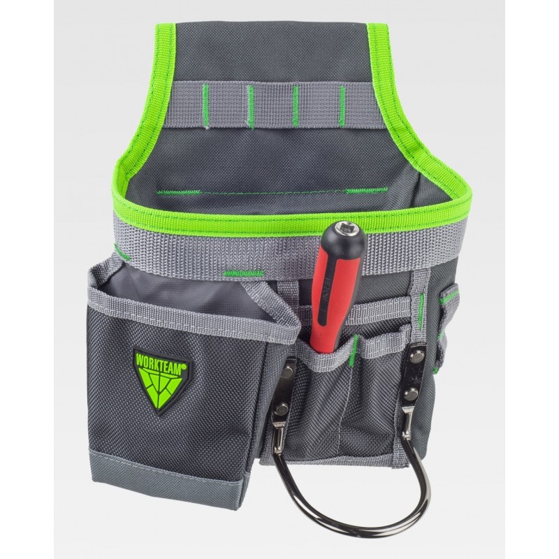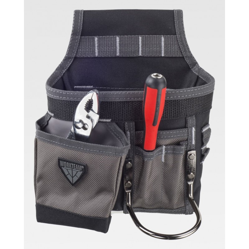 Bolsa para herramientas multibolsillos con diversas aberturas, argolla metálica y tira con mosquetón. Enganche metálico para ajustar al cinturón y bies a contraste. Dimensiones: 23x19x4 cm aprox.