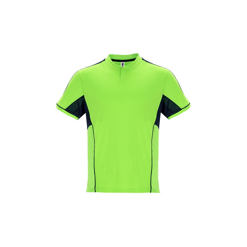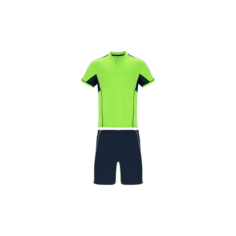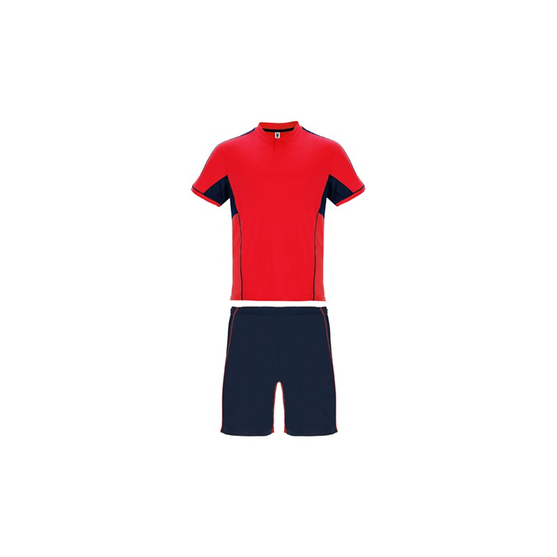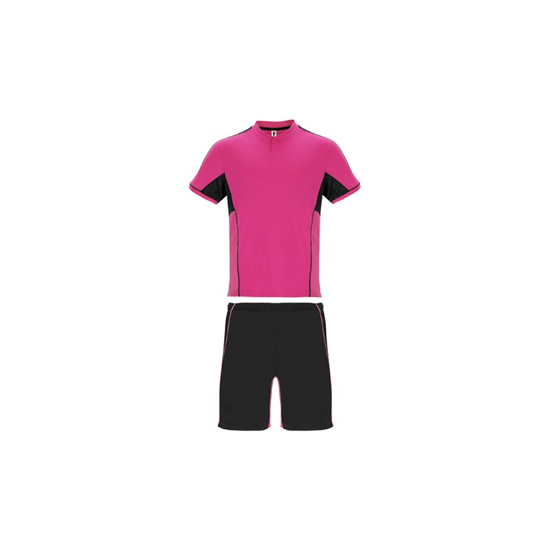 Conjunto deportivo unisex con combinación de tres tejidos, camiseta con cuello mao y apertura mediante broche de presión, interior de la manga en tejido tranpirable, paneles laterales y banda superior de manga en tejido control dry, pantalón corto con cinturilla ajustable y cordones y parte interior de la pierna y vivos a contraste en tejido control dry.