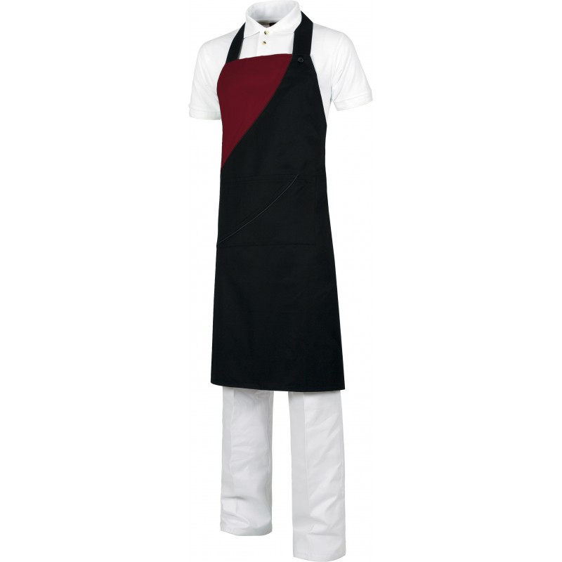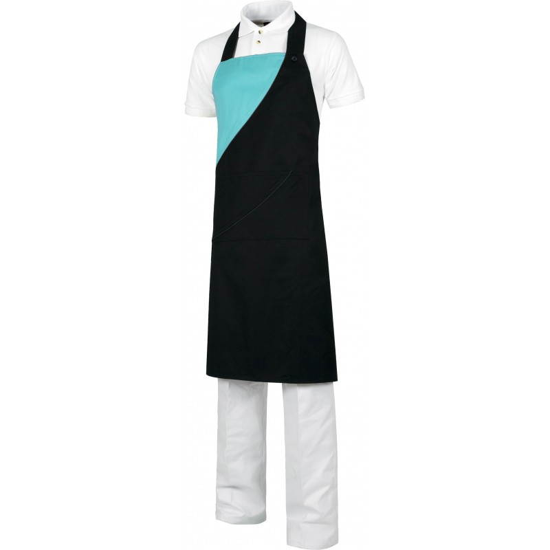 Delantal de trabajo francés corto con parte superior y cintura combinada, un bolso central con corte de fantasía rematado con vivo, tiras para ajustar en la cintura. Tamaño: 70X45 cm.