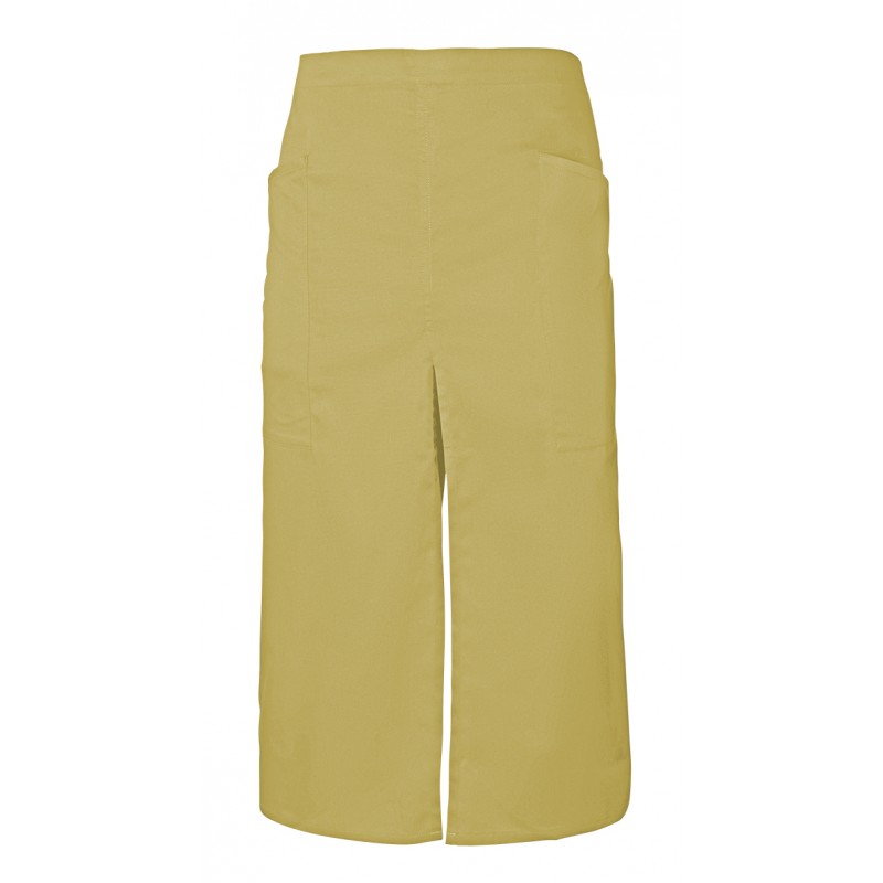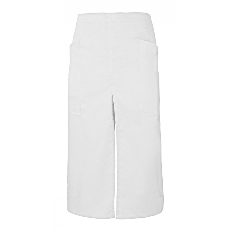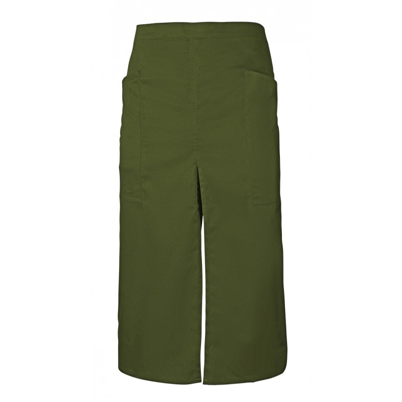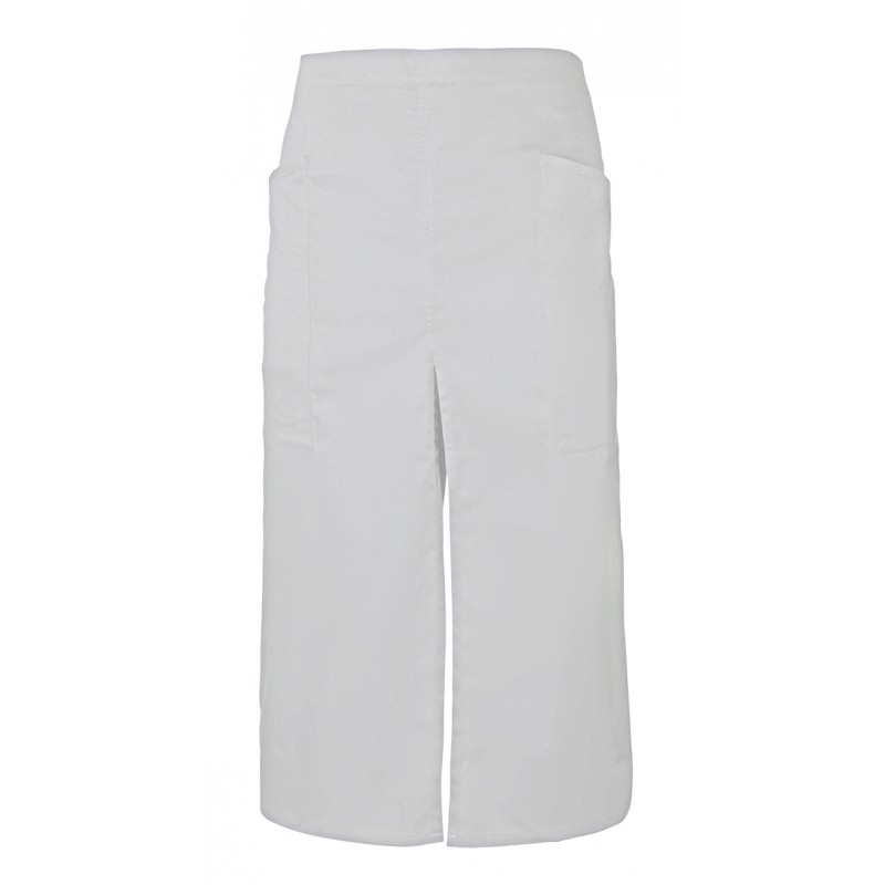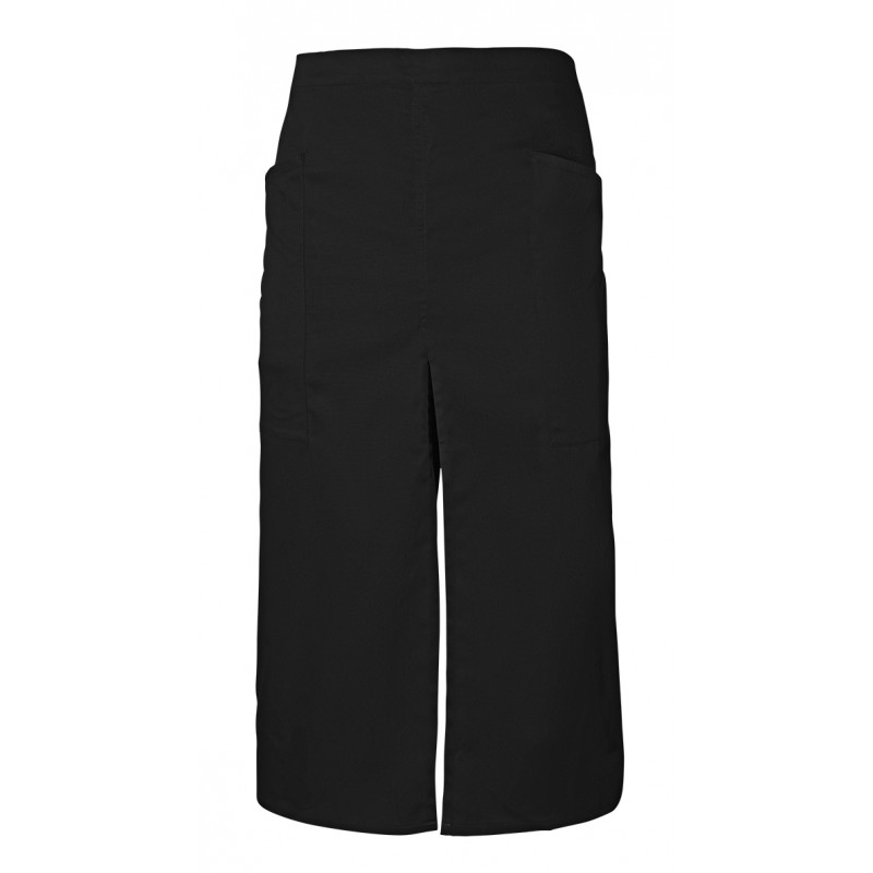 Delantal largo con abertura y bolsillos.