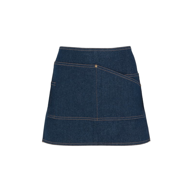Delantal largo en tejido vaquero, cinta del cuello a contraste ajustable en tres posiciones mediante botón metálico, un bolsillo en pecho, cuatro bolsillos frontales con remaches, uno de ellos especifico para el bolígrafo y cintas laterales a contraste para lazada.