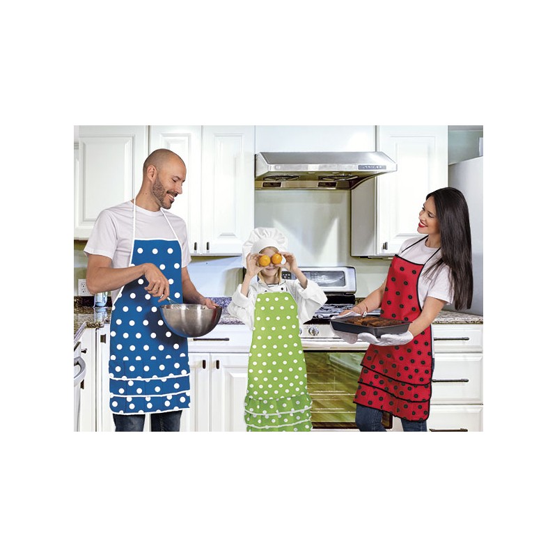 Delantal promocional y festivo, confeccionado en tejido estampado a topos.