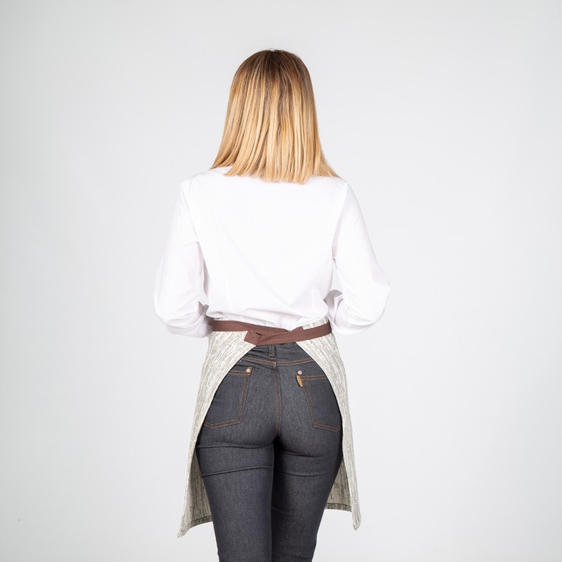 Delantal corto confeccionado en original tejido de efecto marmolado gris, con cuatro bolsillos delanteros en la zona central y tiras para anudar en espiga de color marrón.