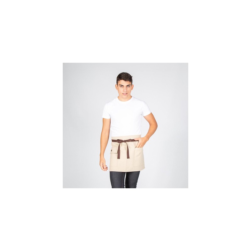 Delantal corto con dos bolsillos delanteros, con tiras laterales para anudar.