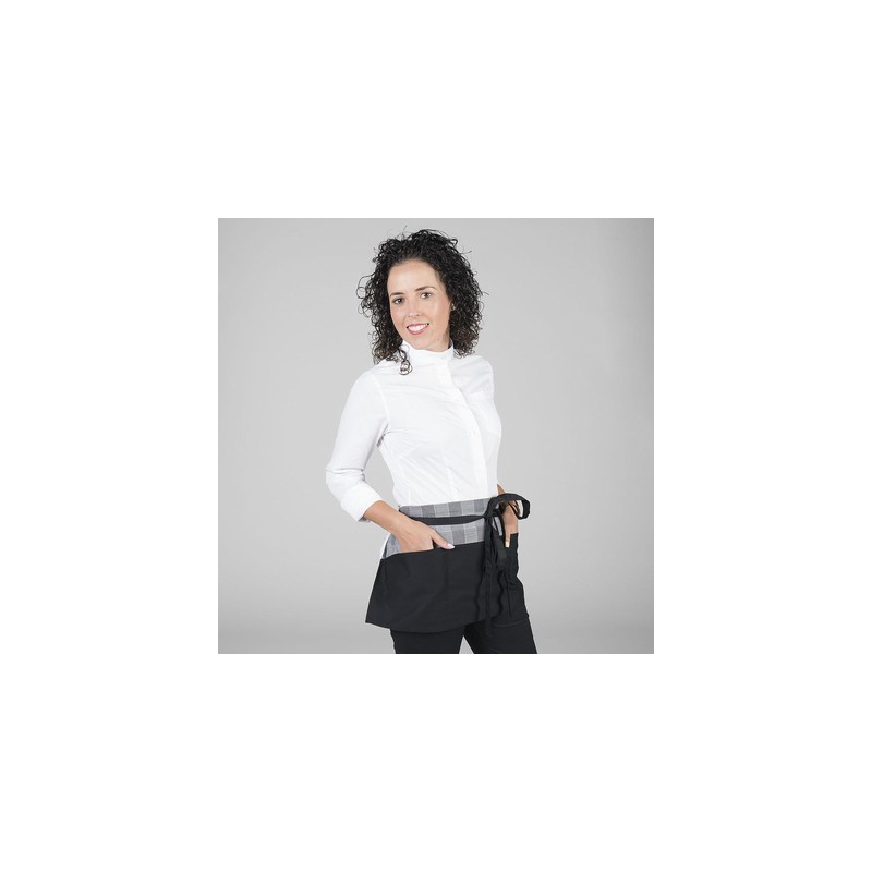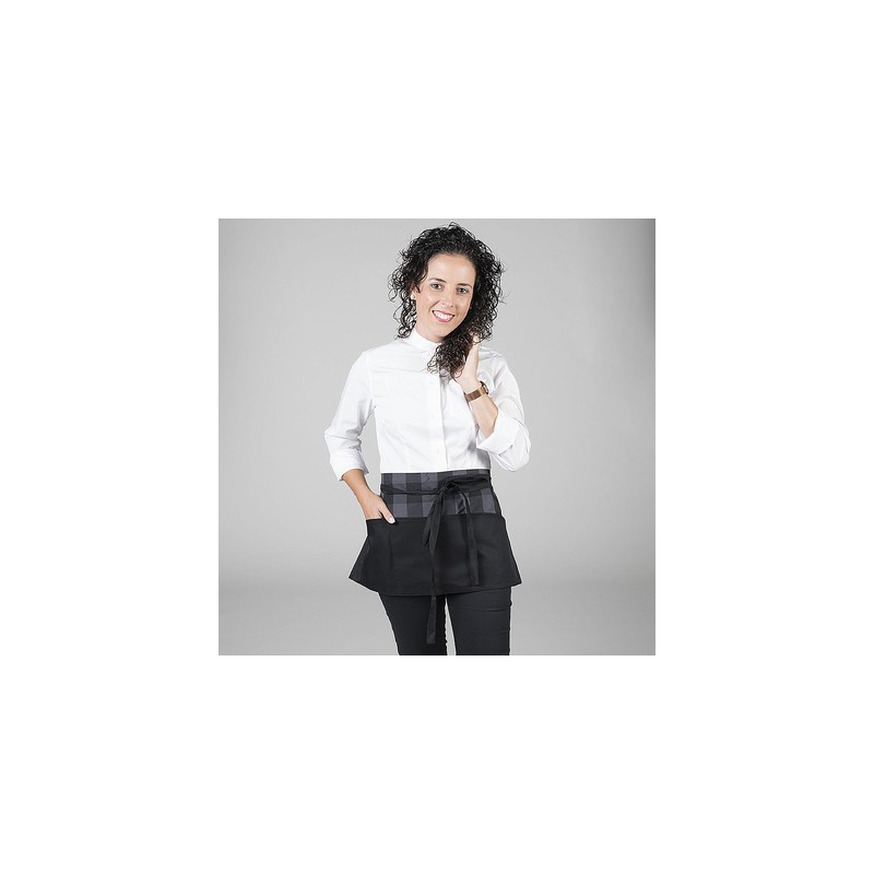 Delantal corto con tres bolsillos delanteros y cintas para anudar del mismo tejido, disponible con la combinación en estampado Gales o cuadros grises.
