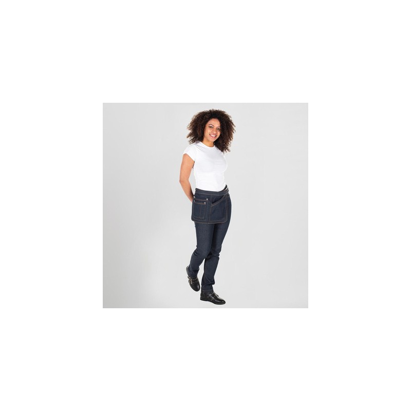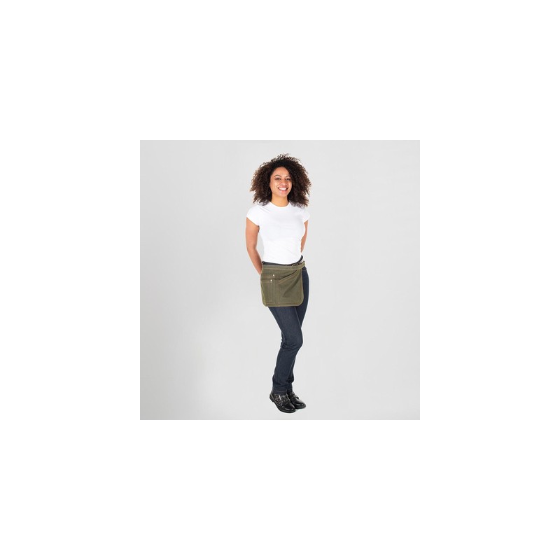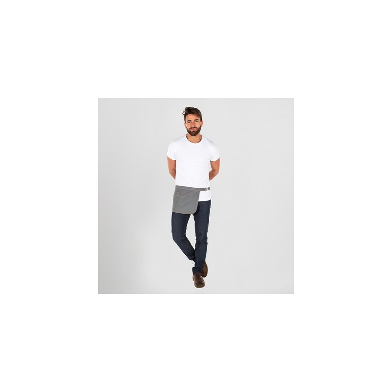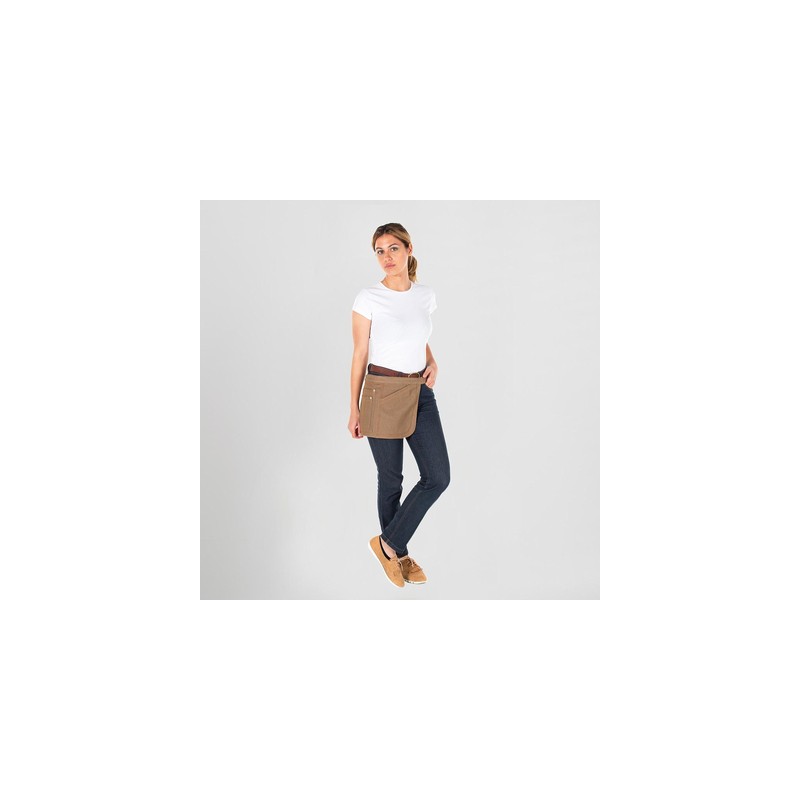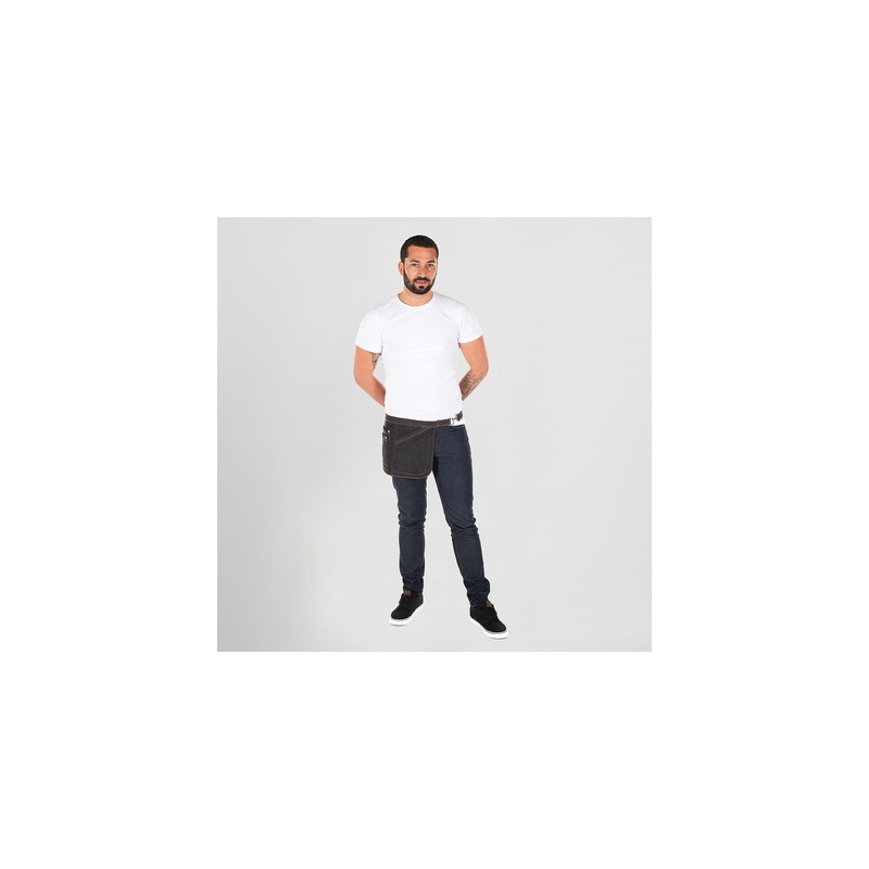 Delantal monedero confeccionado en vaquero elástico, colocación lateral, cuatro bolsillos, hebilla para regular la tira de ajuste y enganche mediante mosquetón y anilla.