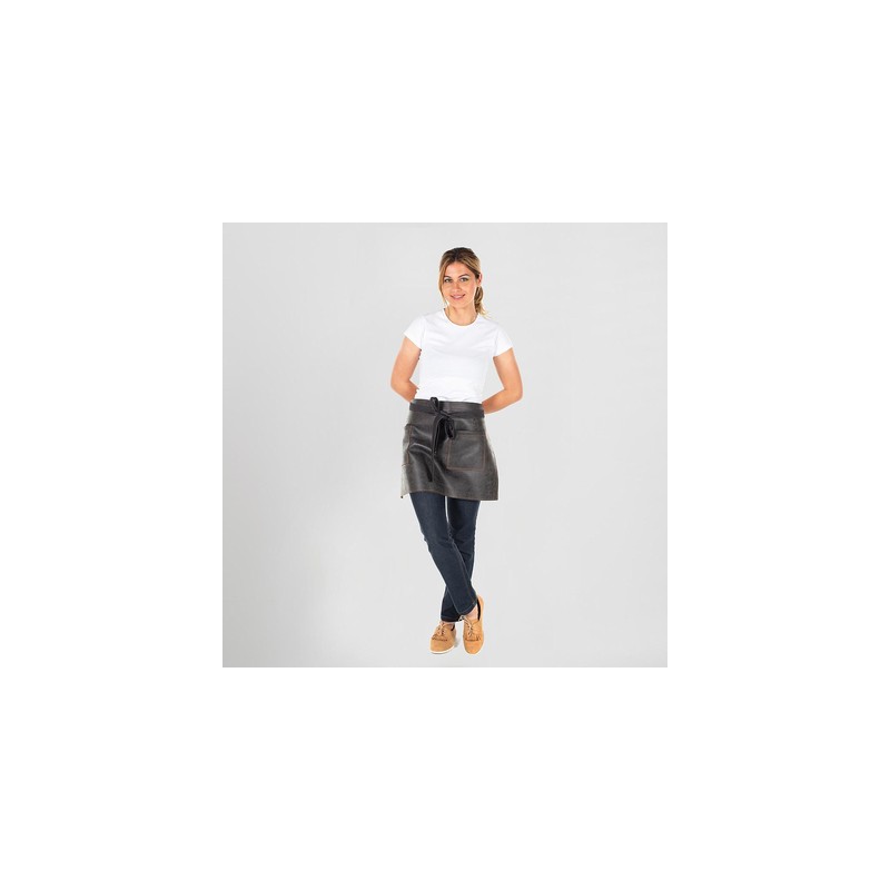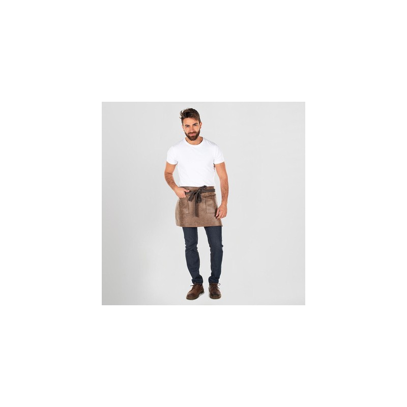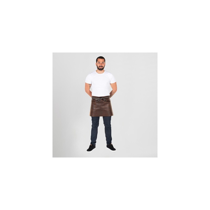 Delantal corto confeccionado en piel 100% reciclada, con tiras para anudar en vaquero elástico marrón.