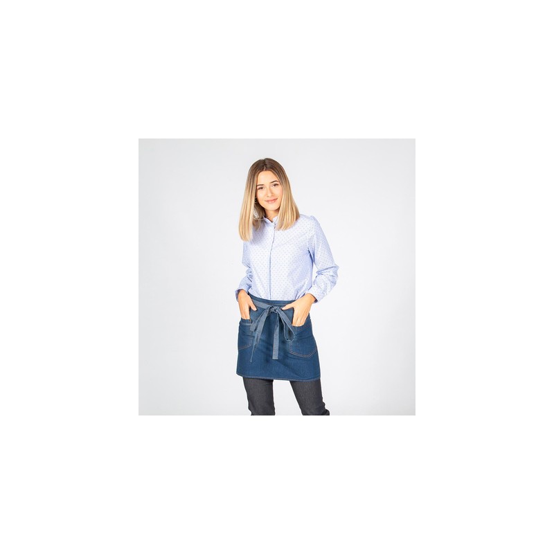 Delantal con peto confeccionado en vaquero lavado de 100% Algodón, un bolsillo en pecho izquierdo y dos en laterales, cinta del cuello con hebilla reguladora para ajustar. Ideal para uniforme de bares, restaurantes y comercios.