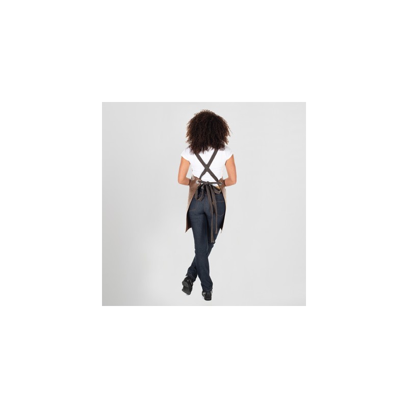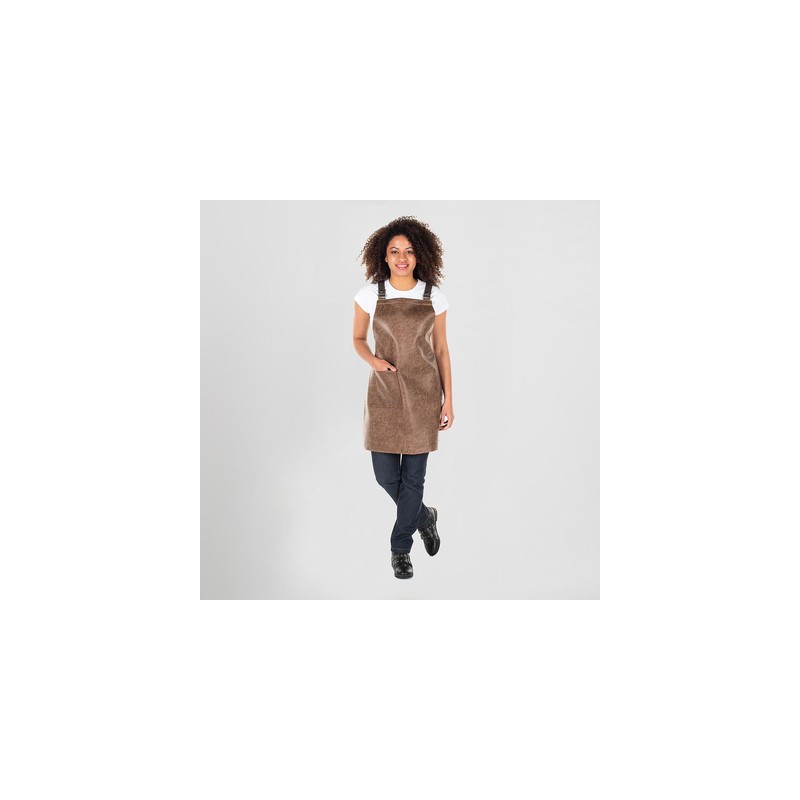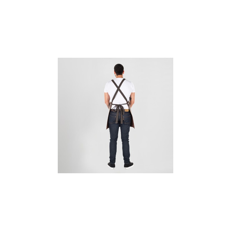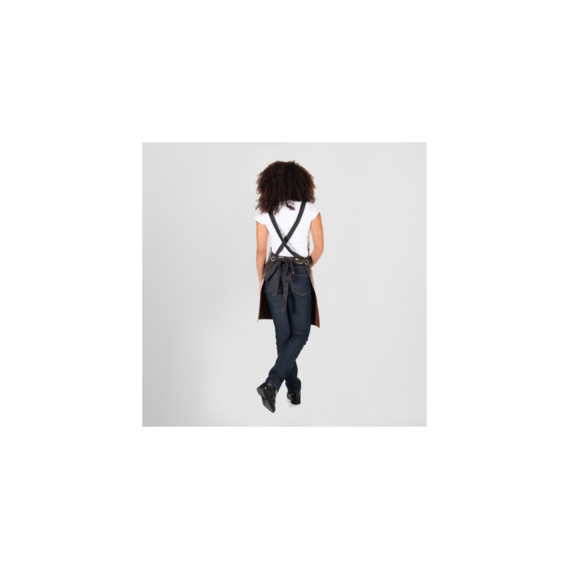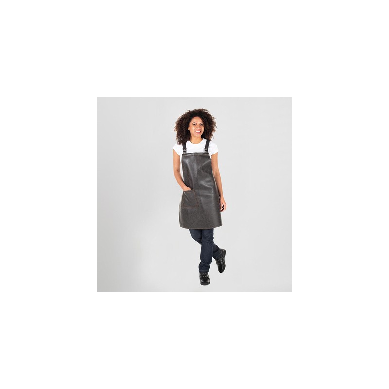 Delantal con peto confeccionado en PIEL 100% reciclada, dos bolsillos delanteros, tiras de ajuste van en tejido vaquero enganchadas mediante hebillas y ollados.