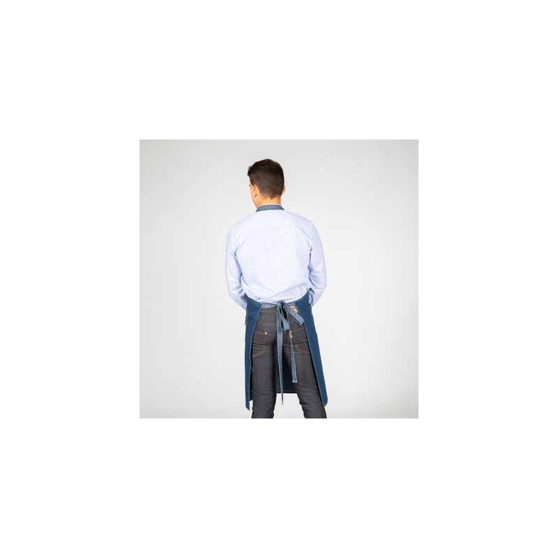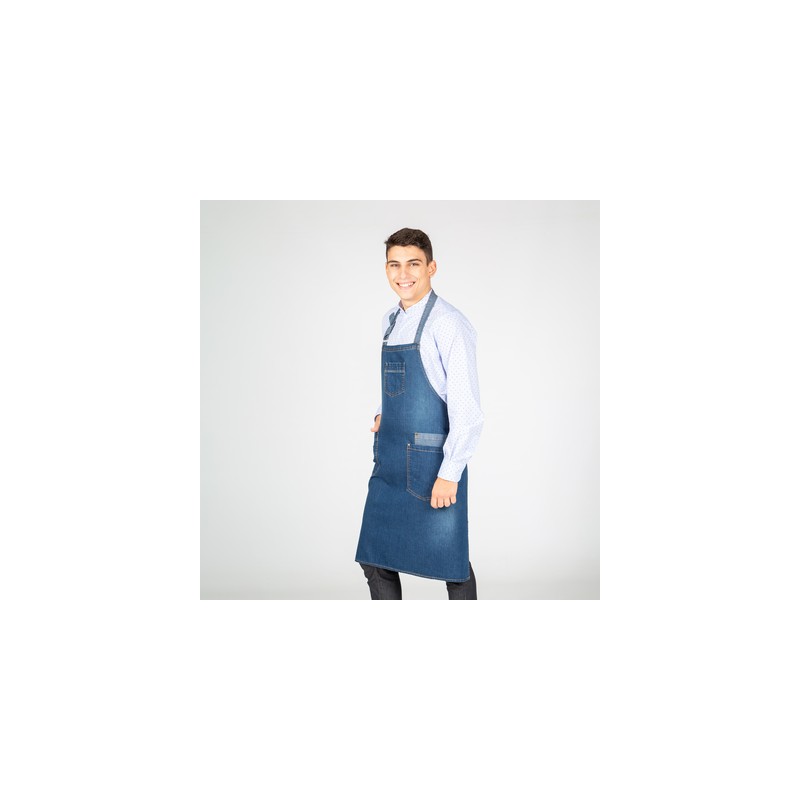 Delantal de peto con cuatro bolsillos delanteros, tirante del cuello fijado mediante hebilla metálica regulable y tiras laterales para anudar, confeccionado en tejano añil, con original combinación del tejido al revés en los bolsillos.