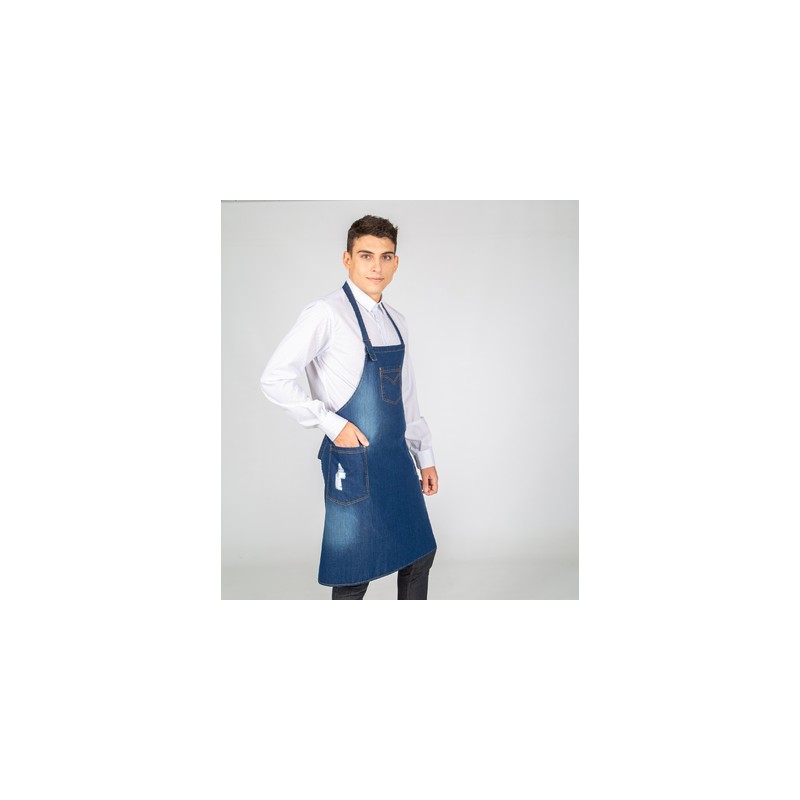 Delantal de peto con tres bolsillos delanteros, tirante del cuello fijado mediante hebilla metálica regulable y tiras laterales para anudar, confeccionado en tejano añil desgastado.