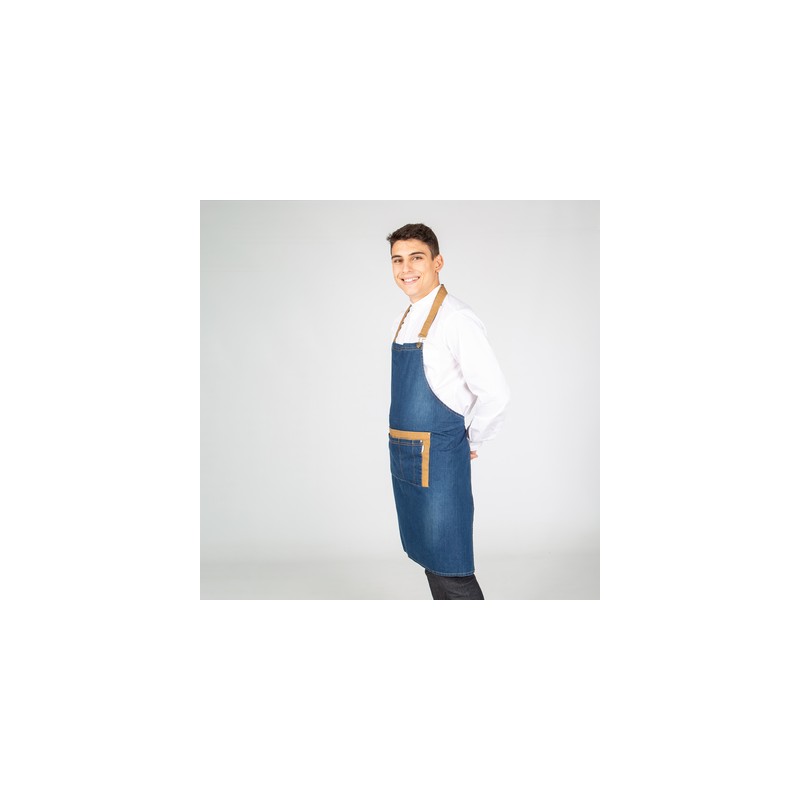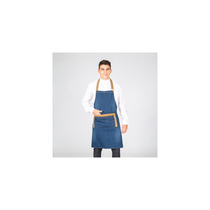Delantal de peto con cuatro bolsillos delanteros, con tirante del cuello fijado mediante hebilla metálica regulable y botón y tiras laterales para anudar, confeccionado en tejano lavado, combinado en color albero.
