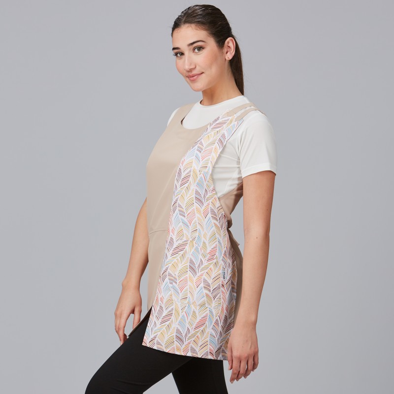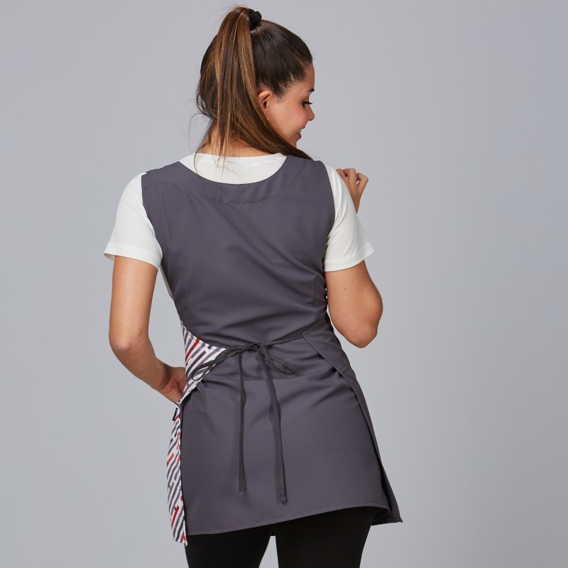 Casulla tipo estola con cremallera y diseño estampado que proyecta una imagen moderna en centros de belleza y comercio. Bolsillo interior lateral para utensilios esenciales y tiras laterales para un ajuste rápido y cómodo. Sarga 100% Poliéster de 208 g/m²: resistente, fácil cuidado y buen aspecto tras los lavados.