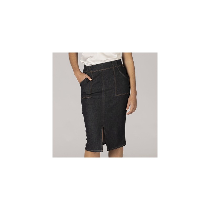 Falda ajustada sin cinturilla, confeccionada en vaquero elástico, dos bolsillos en delantero, cerrada mediante cremallera lateral, abertura delantera, proporcionando mayor comodidad.