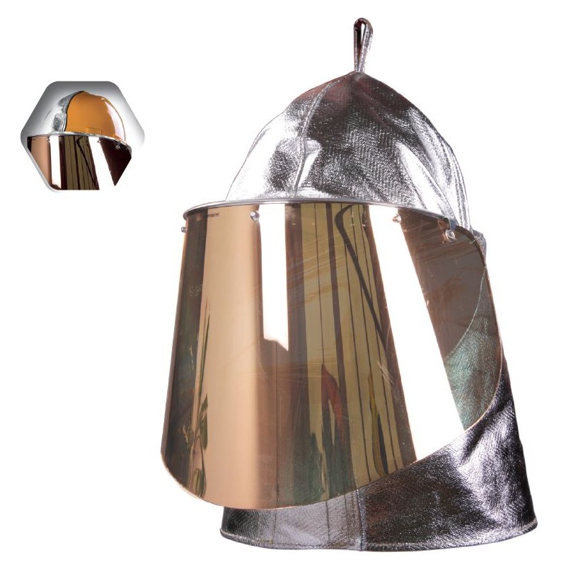 Capuchón aluminizado de visor panorámico, casco F.R. incorporado y cierre con cintas ajustables. Visor no incluido.