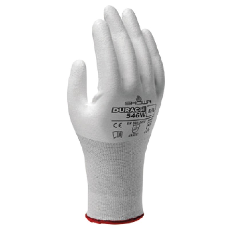 Guante con recubrimiento de poliuretano blanco, reforzado sobre forro de diseño Duracoil, reforzado con HPPE, nivel de corte C para la manipulación precisa en entornos sensibles a la suciedad.