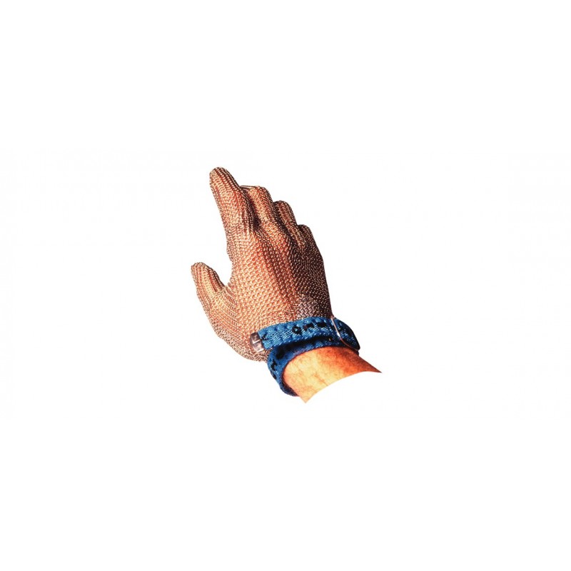 Guante de cota de malla de acero inoxidable AISI 316L con correa textil ajustable y cierre de botón de presión.