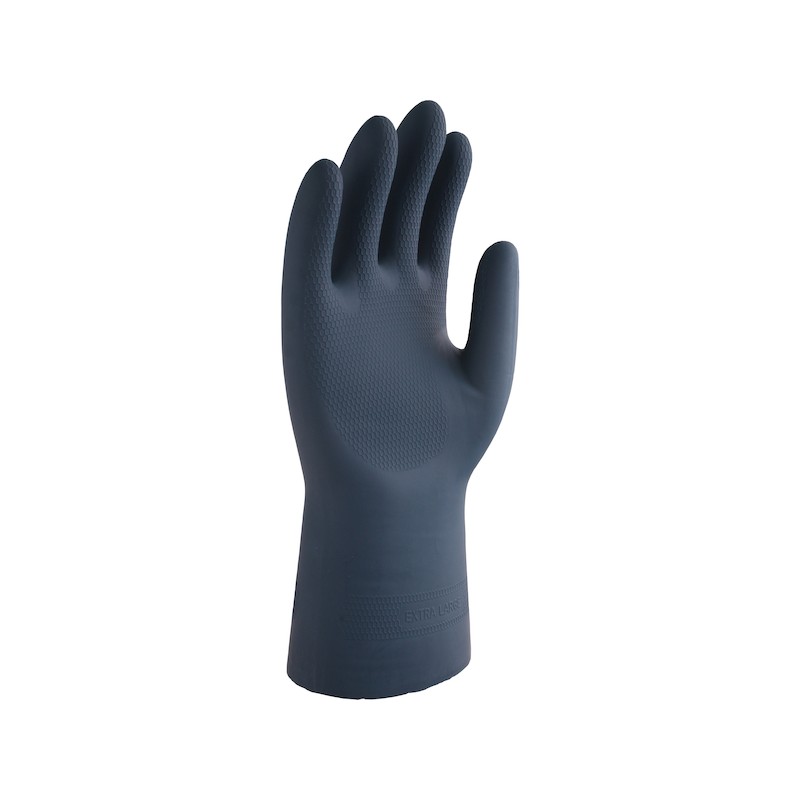 Un guante de caucho reutilizable de servicio medio de 13" fabricado con un compuesto de caucho natural y neopreno para mejorar la protección contra la abrasión y la perforación.