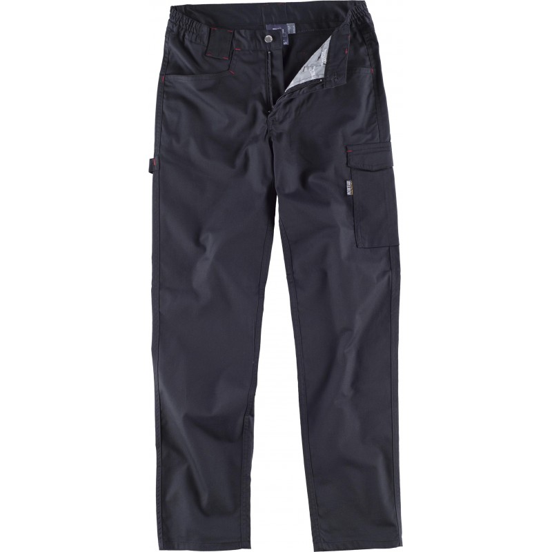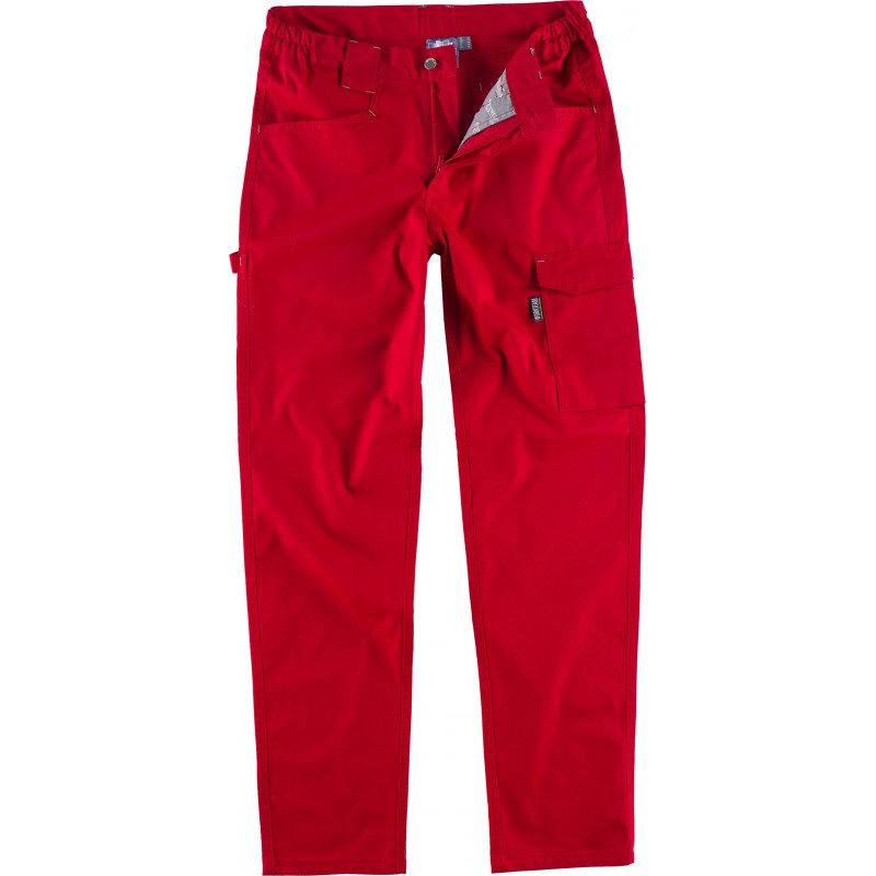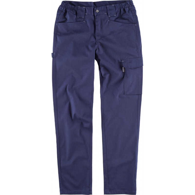 Pantalón de tejido elástico bidireccional por construcción, dos bolsos de abertura inclinada en los costados y un bolso lateral con pliegue inferior y cartera de velcro, dos bolsos traseros con pliegue inferior, uno con cartera de velcro y un bolso de espátula y trabilla porta martillo.