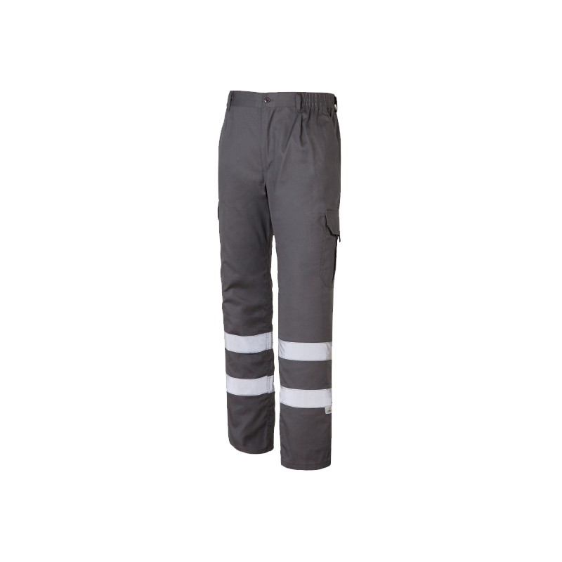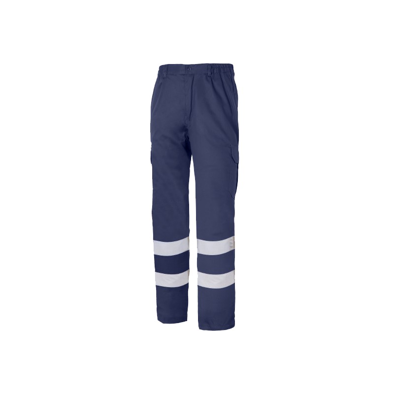 Pantalón de trabajo multibolsillos, elásticos laterales en cintura, cierre de botón y cremallera, dos bolsillos delanteros de mano, dos bolsillos traseros de cartera con cierre de botón, dos bolsillos en pernera con tapeta de cierre de velcro, dos bandas reflectantes cosidas en perneras y forro interior cosido al pantalón.