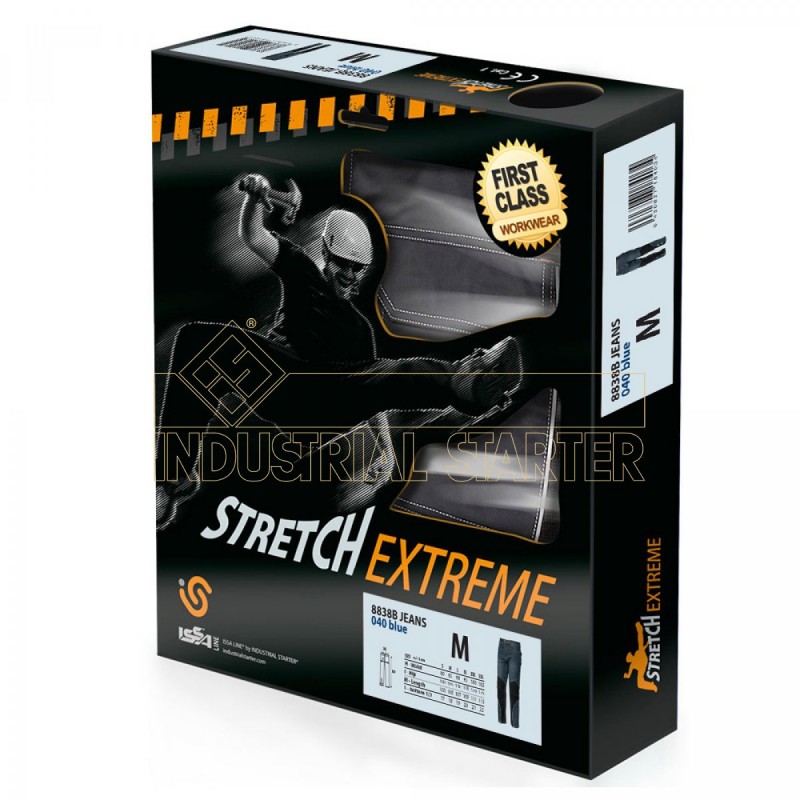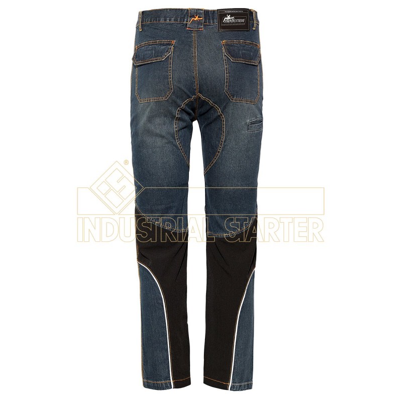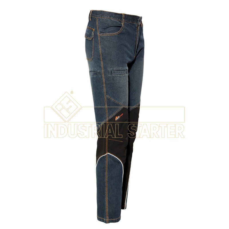 Pantalón Jeans de corte deportivo con refuerzos antiabrasión, tejido cordura, unido con refuerzo trasero, para mejorar la dureza de este tejido, consta de cuatro bolsillos, más un bolsillo porta móvil y un porta metro.