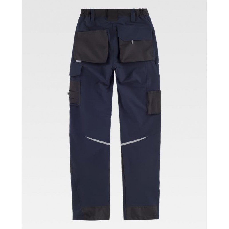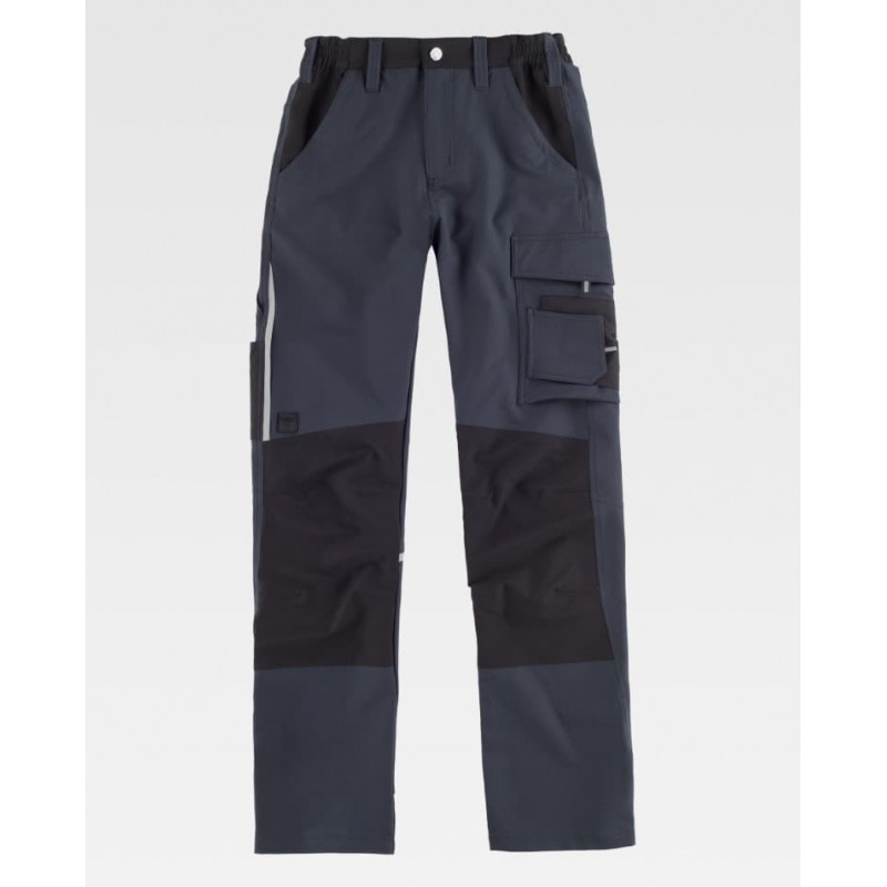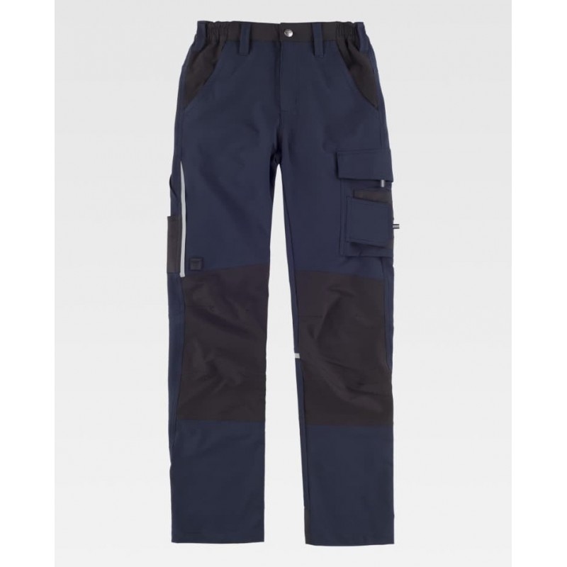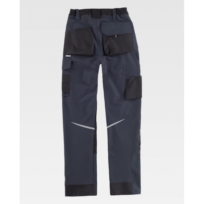 Cortes decorativos y pinzas en rodillas, detalles reflectantes, elástico en los laterales de la cintura y trabillas.