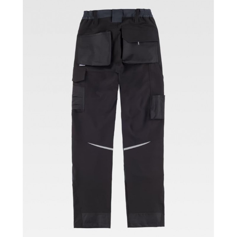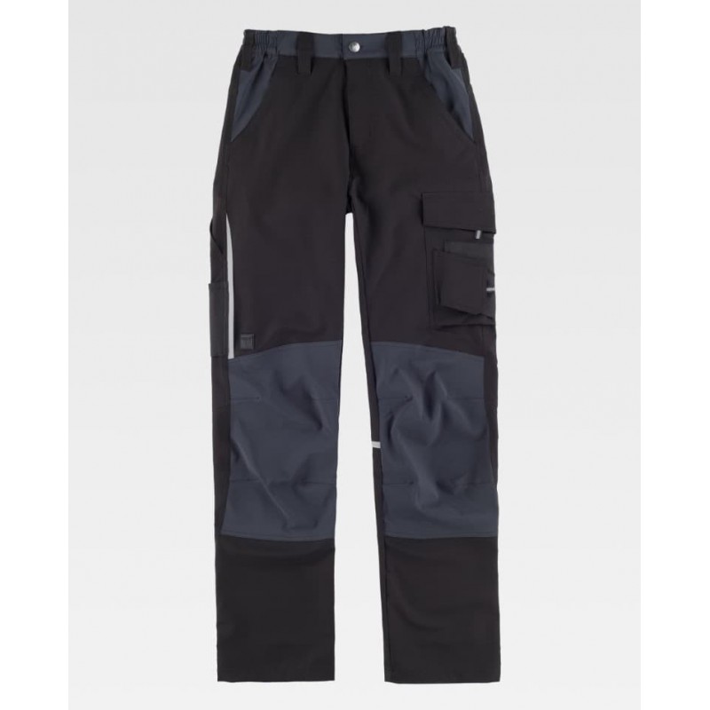 Pantalón elástico combinado con dos bolsillos en los costados, uno de espátula, cartera de velcro y uno auxiliar superpuesto y compartimentado con cartera de velcro en perneras, dos bolsos traseros con fuelle, uno de ellos con cartera de velcro.