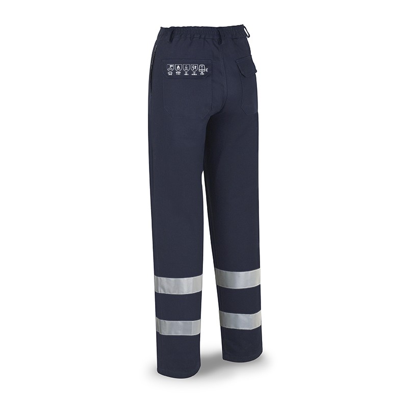Pantalón ignífugo y antiestático multinorma con cintas reflectantes, orientado a trabajos con exposición a calor, llama y operaciones de soldeo.