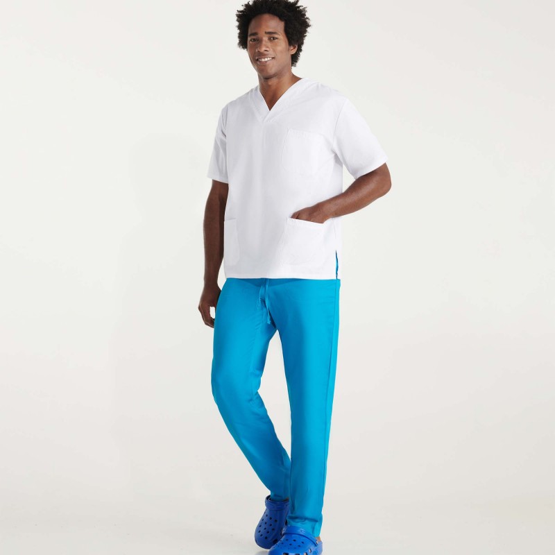 Casaca de servicios unisex de manga corta y escote de pico cruzado, un bolsillo en pecho y dos bolsillos laterales, aperturas laterales, escote en V y tres bolsillos frontales. Realiza tu profesión de forma segura y cómoda con la casaca PANACEA.