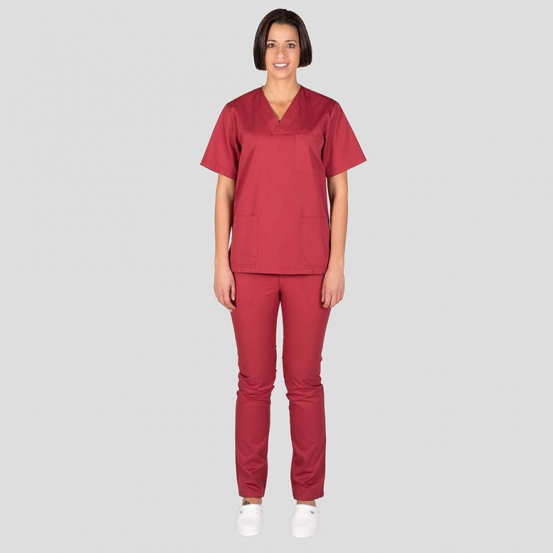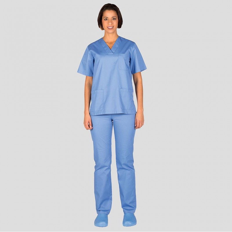Pijama unisex formado por casaca en manga corta, con cuello de pico, un bolsillo en el pecho izquierdo y dos bolsillos de parche delanteros y pantalón con media goma en cintura trasera, cremallera y botón. Ideal para uniformes de enfermería , doctores y demás profesionales sanitarios en hospitales, clínicas y centros médicos, laboratorio, farmacia,...