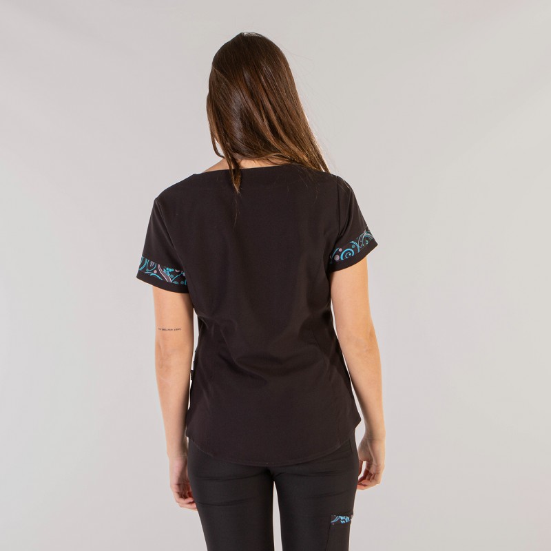 Casaca para mujer en manga corta, con elegante escote en pico, bajo con corte redondeado y cuatro bolsillos delanteros, prenda semi ajustada, con costadillos delanteros y traseros, pinzas en el pecho y aberturas laterales.