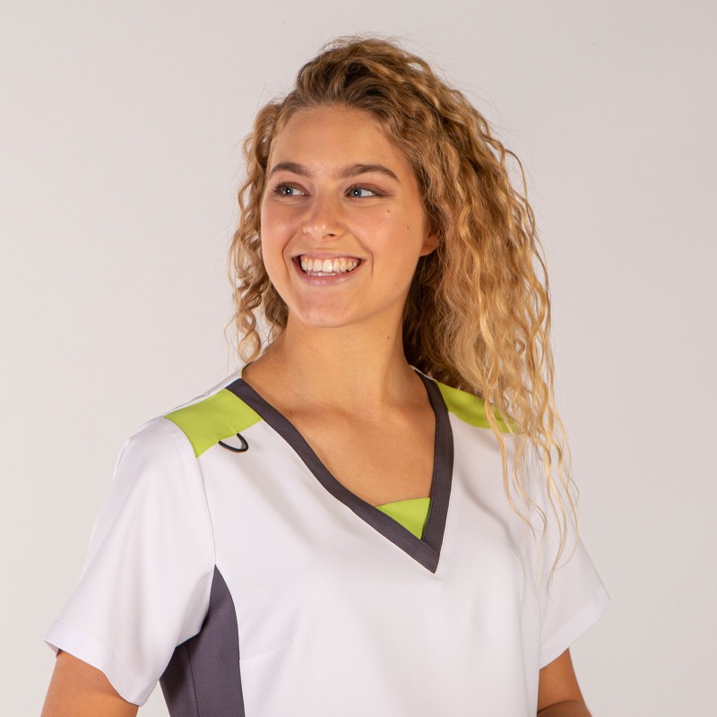 Tejido principal en color blanco, combinado en gris y pistacho con tejido técnico AEROSILVER en costados y escote.