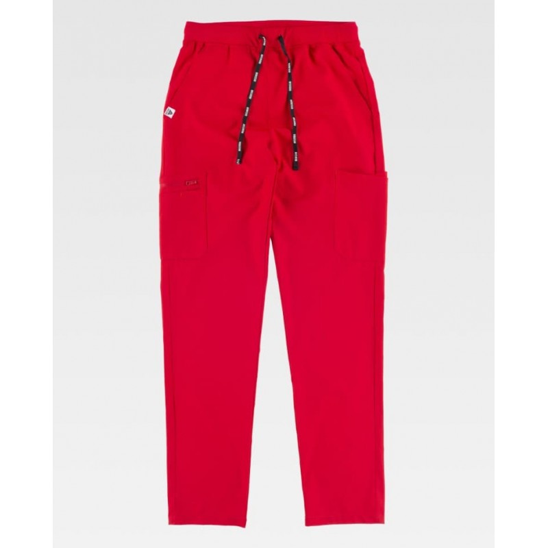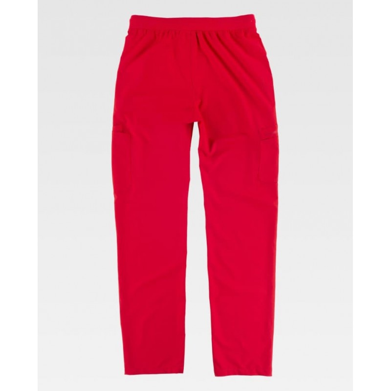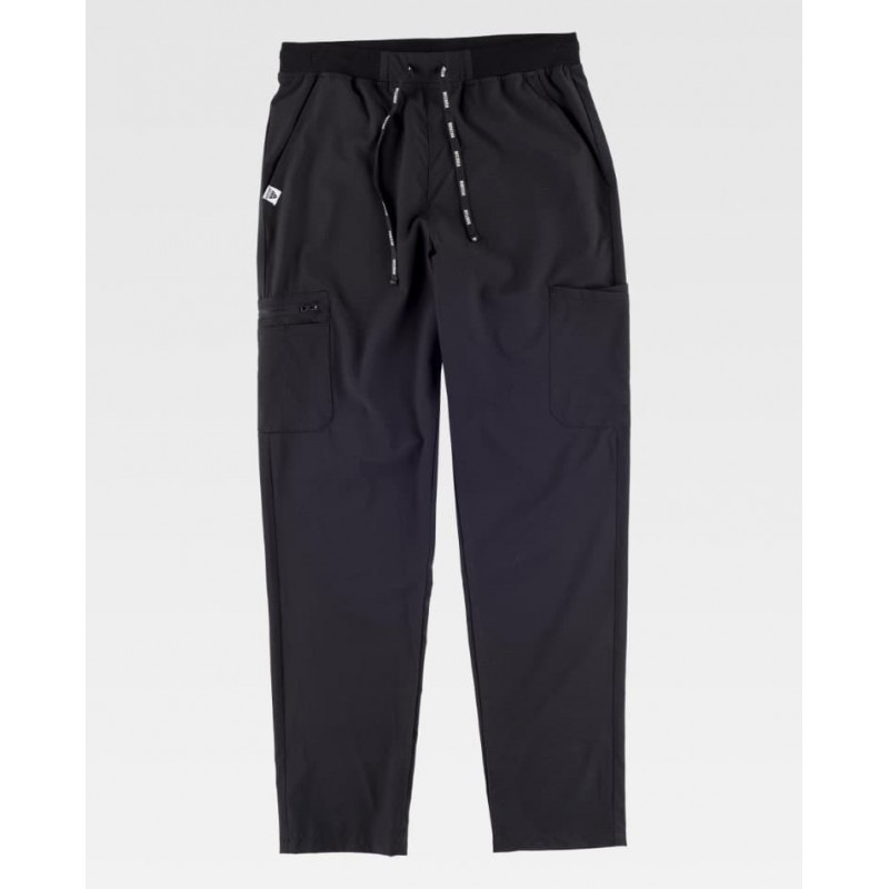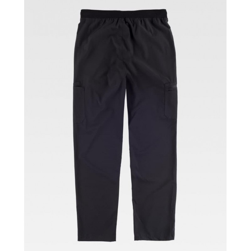 Pantalón unisex con tejido elástico, dos bolsos de abertura inclinada en los costados, bolsos dobles de plastón en perneras, uno de ellos con cremallera.