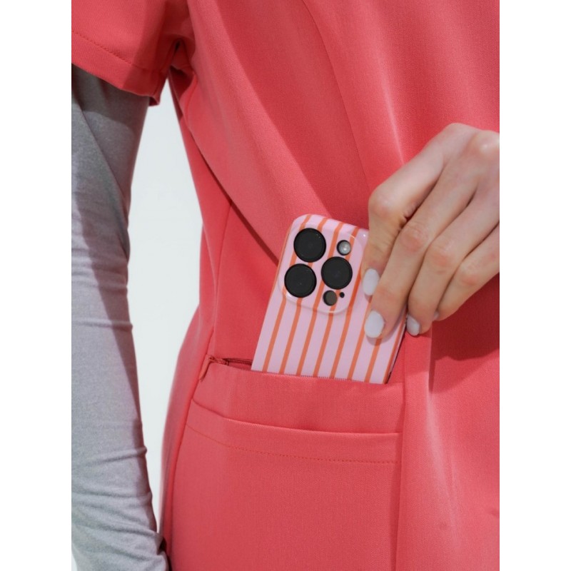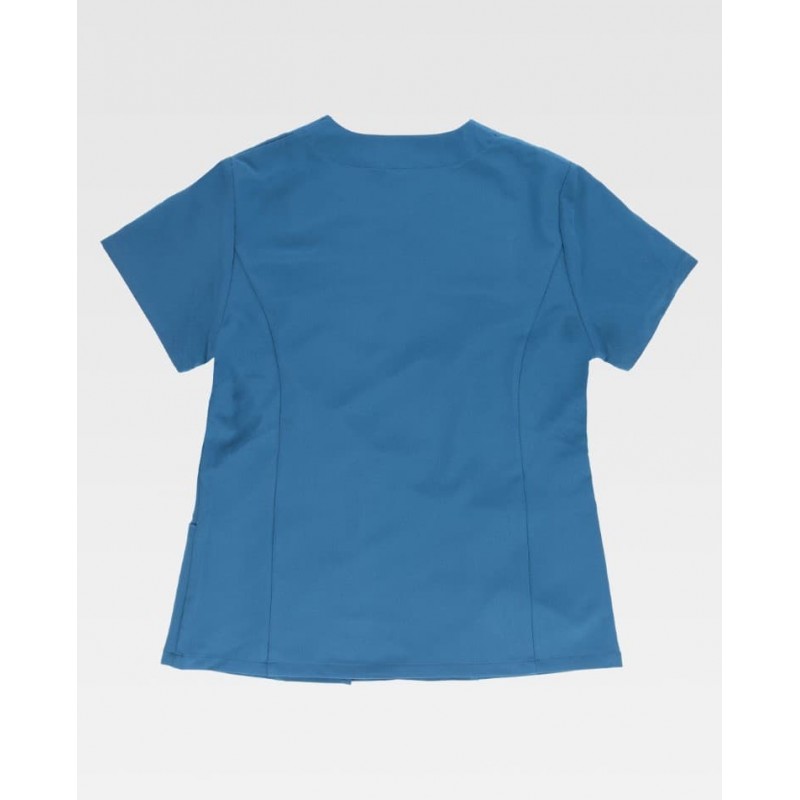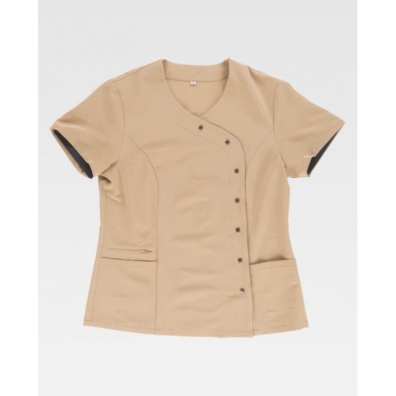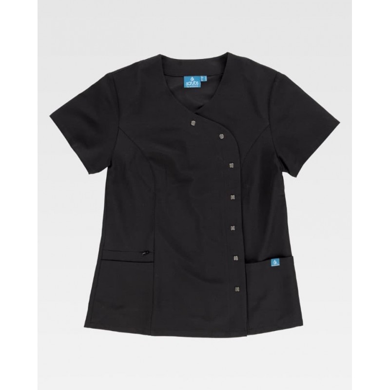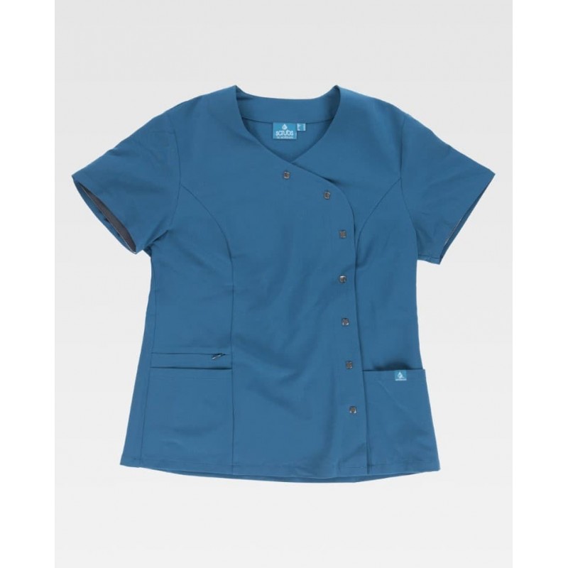 Casaca sanitaria entallada cruzada con manga francesa y tejido elástico, pensada para aportar comodidad y una imagen cuidada en el entorno profesional. Incluye cuello mao, cierre combinado de corchetes ocultos y botones decorativos, dos bolsillos laterales de plastón y un bolsillo interior con cremallera.