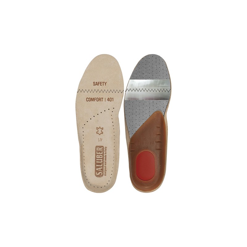 Plantilla anatómica en piel (1), garantiza el apoyo correc to del pie (3), favorece la transpiración y previene los malos olores gracias a una membrana de carbón activo (2). El shock absorber (4) del talón ofrece grandes beneficios a quien durante el trabajo debe permanecer muchas horas de pie: una persona de 70 kg. en cada paso descarga 90 kg. sobre su pie (equivalente a 500 toneladas al día).