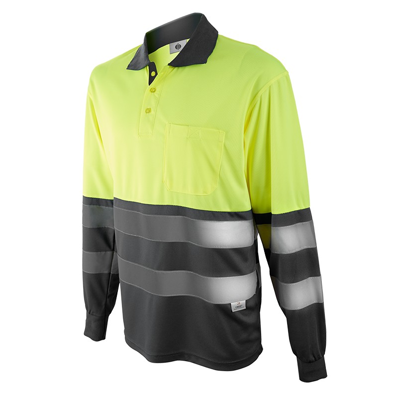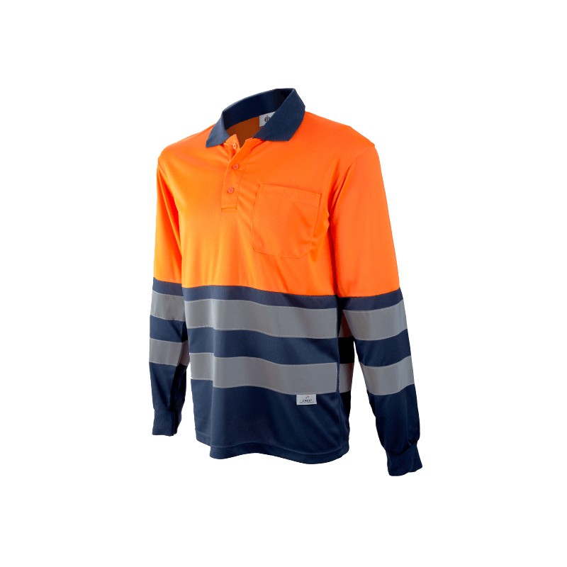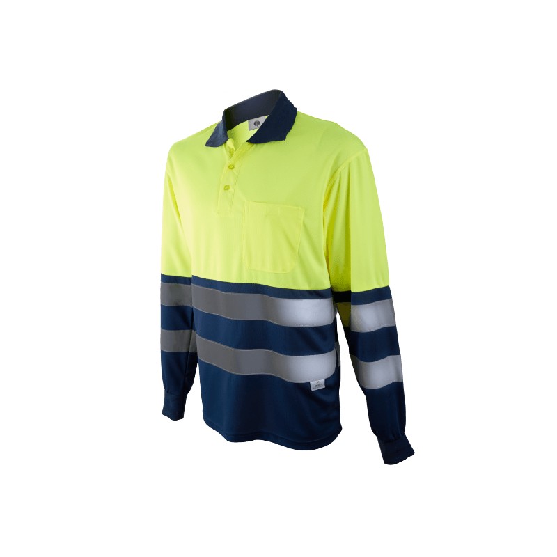 Polo pique de manga larga, un bolsillo en pecho con cierre de velcro, tejido de rejilla en axilas para mejorar la transpirabilidad, tejido piqué transpirable y 2 bandas reflectantes en pecho y brazos de 6 cm de ancho.