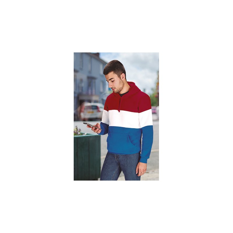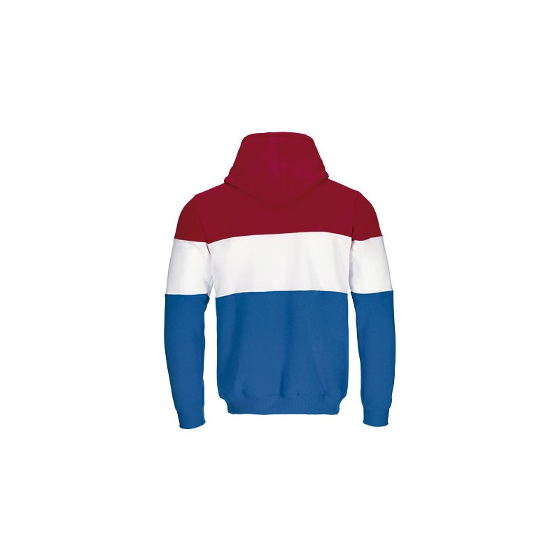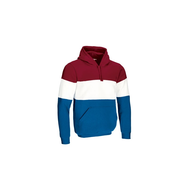 Sudadera con capucha, bolsillo canguro y diseño tricolor por ambas caras, confeccionada en tejido poliéster con tacto algodón y perchado interior para mayor retención térmica y confort.