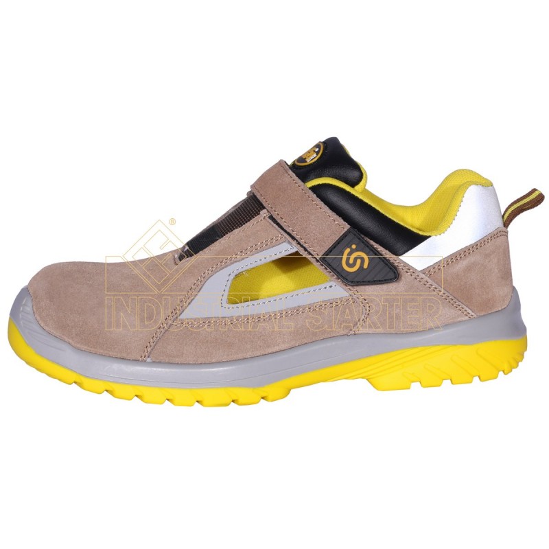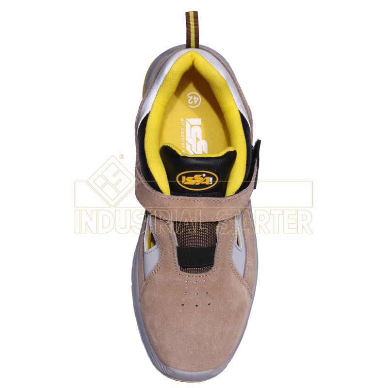 Sandalia de piel de serraje con suela en PU bidensidad antideslizamiento, cierre con velcro y aperturas laterales para mejorar la transpirabilidad del pie.