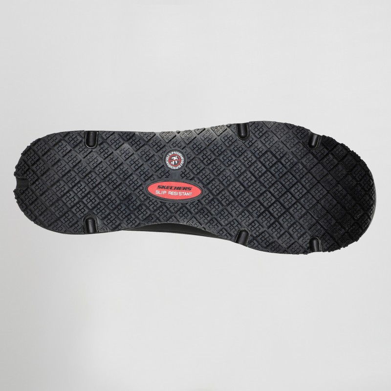 Calzado laboral con absorción de energía alrededor del talón, puntera lisa y redondeada, suela antideslizante, forro de tela suave, suela de goma de tracción antideslizante y plantilla de confort acolchada Skechers Air-Cooled Memory Foam.