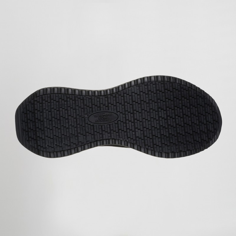 Este diseño slip-on de trabajo cuenta con una malla y parte superior sintética con un cordón elástico, un panel de talón moldeado Skechers Slip-ins, nuestro exclusivo Heel Pillow, puntera de seguridad de composite, y una plantilla acolchada Skechers Air-Cooled Memory Foam.